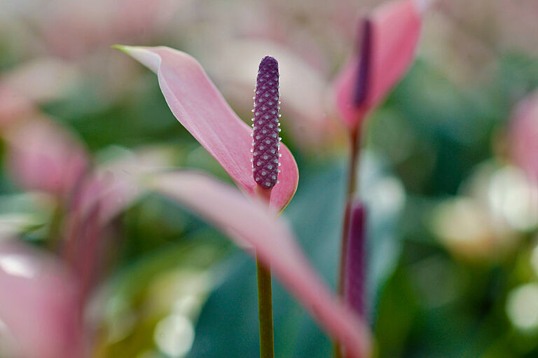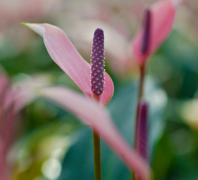 El anturio es una planta perenne de flores hermosas, duraderas y de diversos colores. Sin embargo, la ‘flor’ es en realidad una hoja alterada (también denominada espata) con numerosas flores en el espádice.