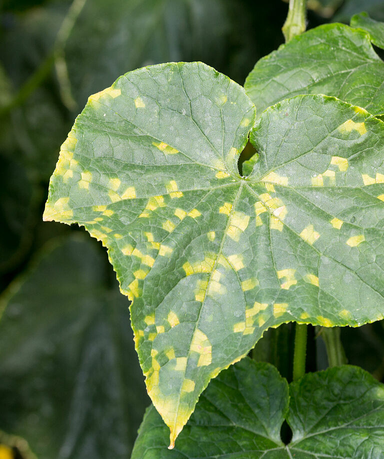 Los patógenos de mildiu velloso infectan sobre todo las hojas, pero ocasionalmente también los tallos y frutos. Causan lesiones en la superficie superior de la hoja, limitadas por los nervios y de color que amarillo, que, más adelante, cambia a marrón. En el envés de las hojas aparecen puntos algodonosos que primero son blancos y luego gris-marrones. Se trata de hecho de la esporulación de los patógenos que emergen de los estomas.