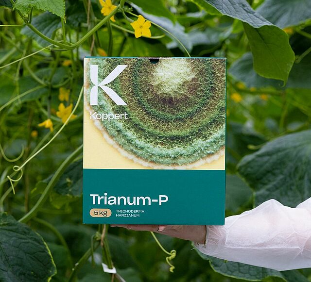 Kees empezó a utilizar Trianum-G en 2020. Basado en el hongo Trichoderma harzianum T-22, el producto coloniza el sistema radicular de la planta y mantiene los hongos patógenos alejados de las raíces. Pone dos gramos de Trianium-G en cada estera antes de poner las nuevas plantas en macetas "dúo" (dos plantas en un cubo de lana de roca).