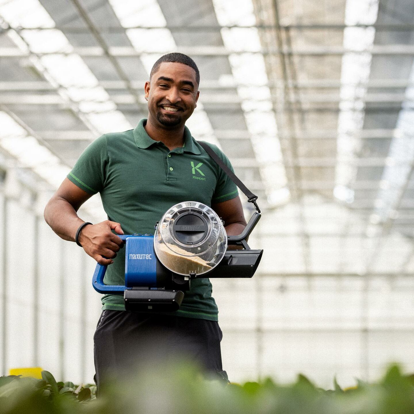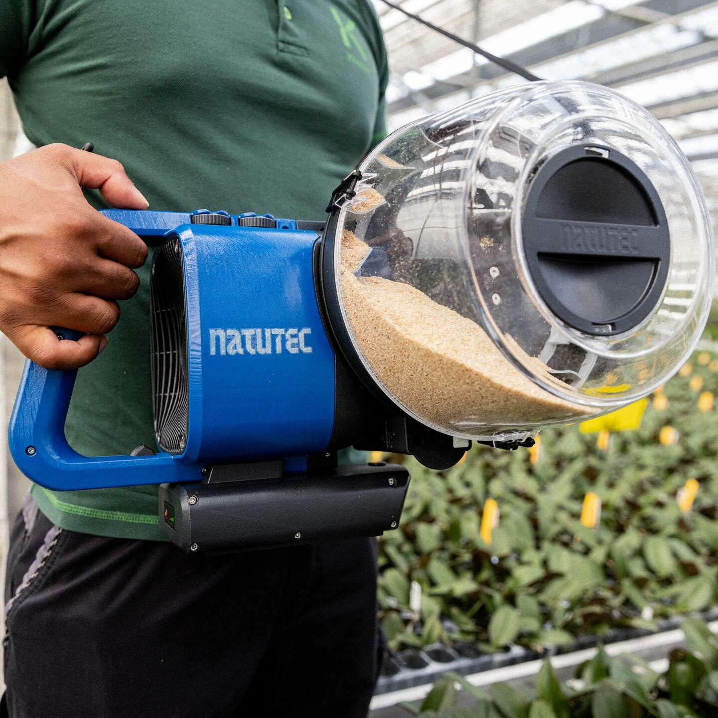 Utilice el Airobreez para la distribución de enemigos naturales en el cultivo. El Airobreez puede utilizarse tanto para la distribución en todo el campo como para puntos calientes específicos.