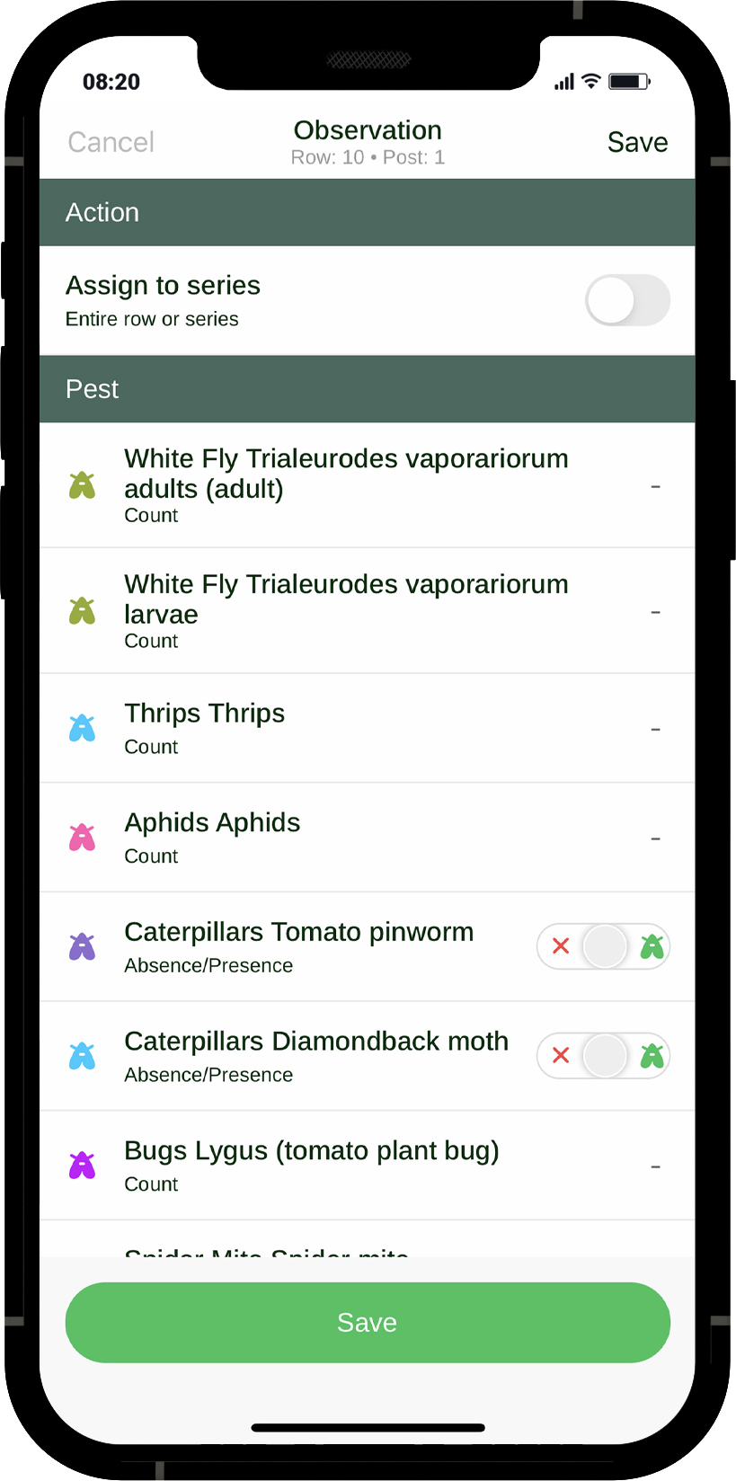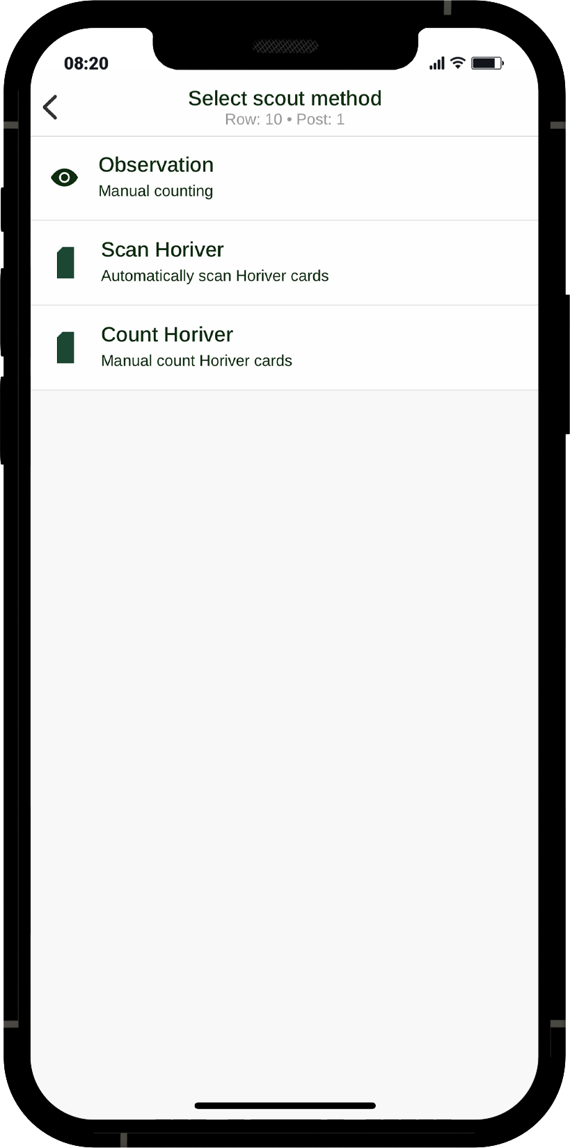 Nuestra aplicación móvil integra nuestros conocimientos profundos y experiencia sobre el monitoreo efectivo de plagas y enfermedades en los cultivos. Ahorre tiempo y aumente la eficiencia a partir de la automatización de la recopilación y análisis de datos, pudiendo dedicar, de esta manera, dicha fuerza de trabajo a otras tareas. Puede escanear las tarjetas adhesivas Horiver mediante nuestra aplicación móvil para identificar y registrar automáticamente los insectos nocivos, como la mosca blanca. Además, esta aplicación móvil le permite registrar todas las anomalías en su invernadero.