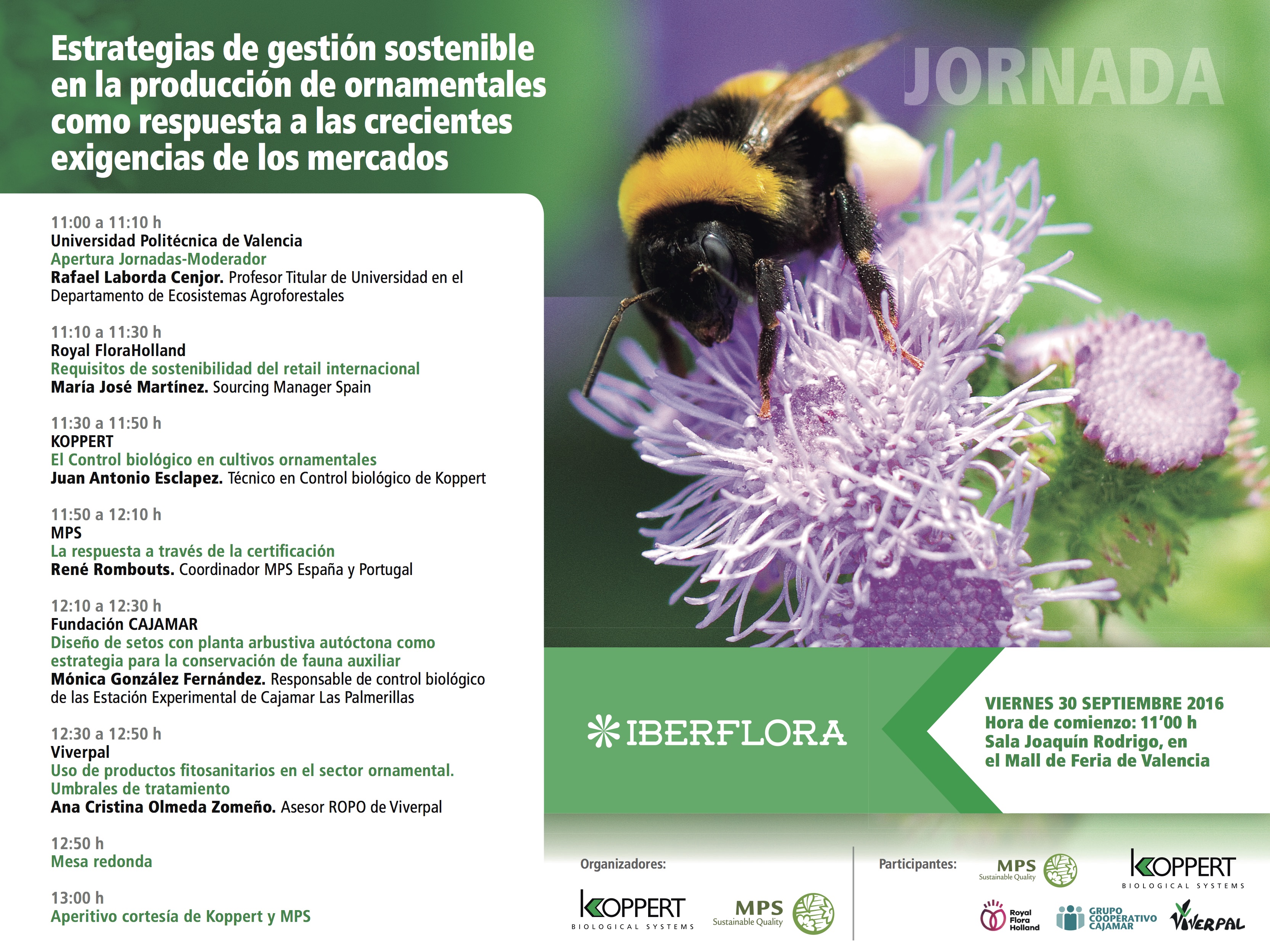 Koppert reforzará su presencia en Iberflora con la celebración el próximo viernes 30 de septiembre, a partir de las 11 de la mañana, de una jornada técnica organizada conjuntamente con la certificadora holandesa MPS y que se celebrará en la sala Joaquín Rodrigo de Feria Valencia. Con el título “Estrategias de producción sostenible en la producción de ornamentales como respuesta a las crecientes exigencias de los mercados, la jornada quiere convertirse en punto de encuentro de todas las empresas interesadas por innovar y reorientar su producción hacia el residuo cero.