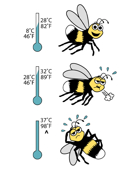 Los abejorros son activos a temperaturas entre 8 y 32 grados centígrados, pero la temperatura optima es entre 8 y 28 grados. A una temperatura entre 28 y 32 grados, su nivel de actividad disminuye gradualmente. A temperaturas más altas, los abejorros dejan de volar. En ese momento, los abejorros se dedican a refrescar la colmena hasta que la temperatura vuelva a descender por debajo de los 32 grados centígrados.