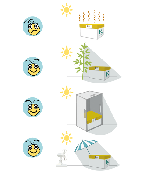 Los abejorros mantienen una temperatura constante en la colmena. Si la temperatura a la que se les expone es demasiado elevada durante un periodo largo de tiempo, la colmena y la colonia pueden sufrir daños. Por eso la colmena de abejorros se debe colocar en el lugar más fresco o, por lo menos, a la sombra, especialmente durante las horas de más calor del día. Asegúrese de que la colmena recibe algo de luz solar durante el oscuro invierno. La sombra puede venir del cultivo, una caja u otros tipos de pantalla. Durante los periodos de temperatura extrema, se requieren medidas adicionales, como una refrigeración activa.