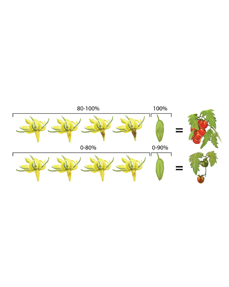 La mejor humedad relativa (HR) para la liberación del polen se sitúa entre el 50% y el 80%. Una humedad relativa de más del 80%-85% provocará que el polen no se libere y los abejorros dejen de trabajar. Una HR inferior al 50% reduce la capacidad de germinación del polen, lo que puede provocar problemas con el cuajado del fruto. Los abejorros seguirán recolectando polen y dejando marcas de mordedura, pero no crecerán frutos.