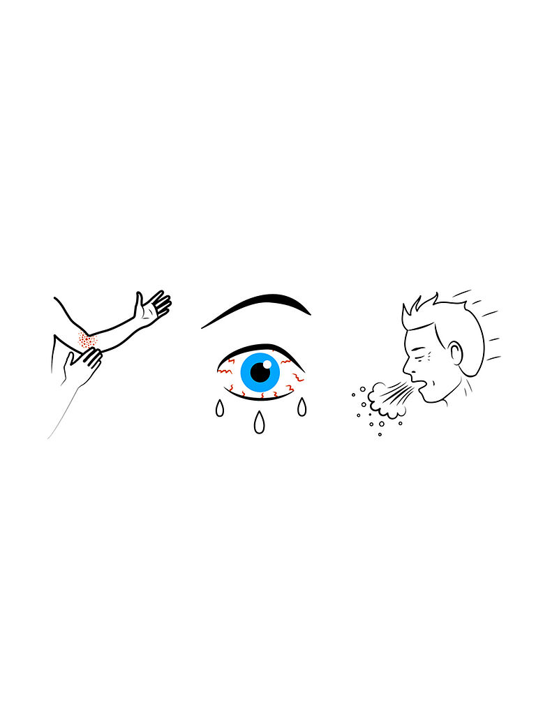 Sin embargo, si entra en contacto con las sustancias en los productos mencionados anteriormente y resulta ser alérgico, puede experimentar síntomas cutáneos (como piel roja y picor o eczema alérgico), nasales (como estornudo, goteo nasal o picor) u oculares (como picor u ojos llorosos).