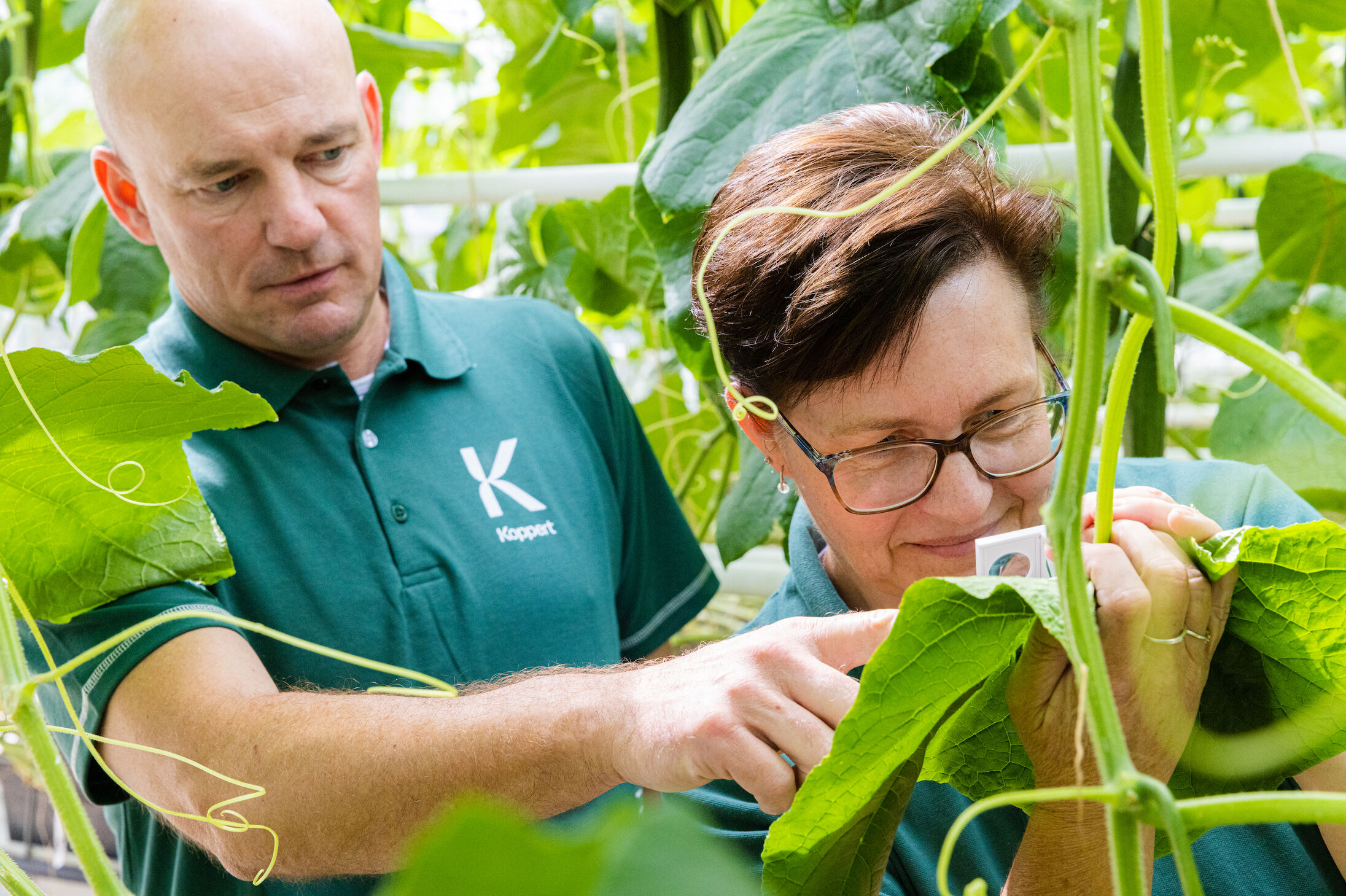 Asesores técnicos de Koppert observan una plaga en pepino