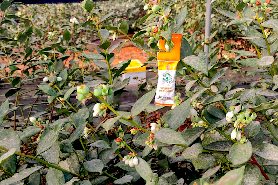 Sobre de Swirski UltiMite en un cultivo de arándano, junto con una colmena de abejorros Natupol.