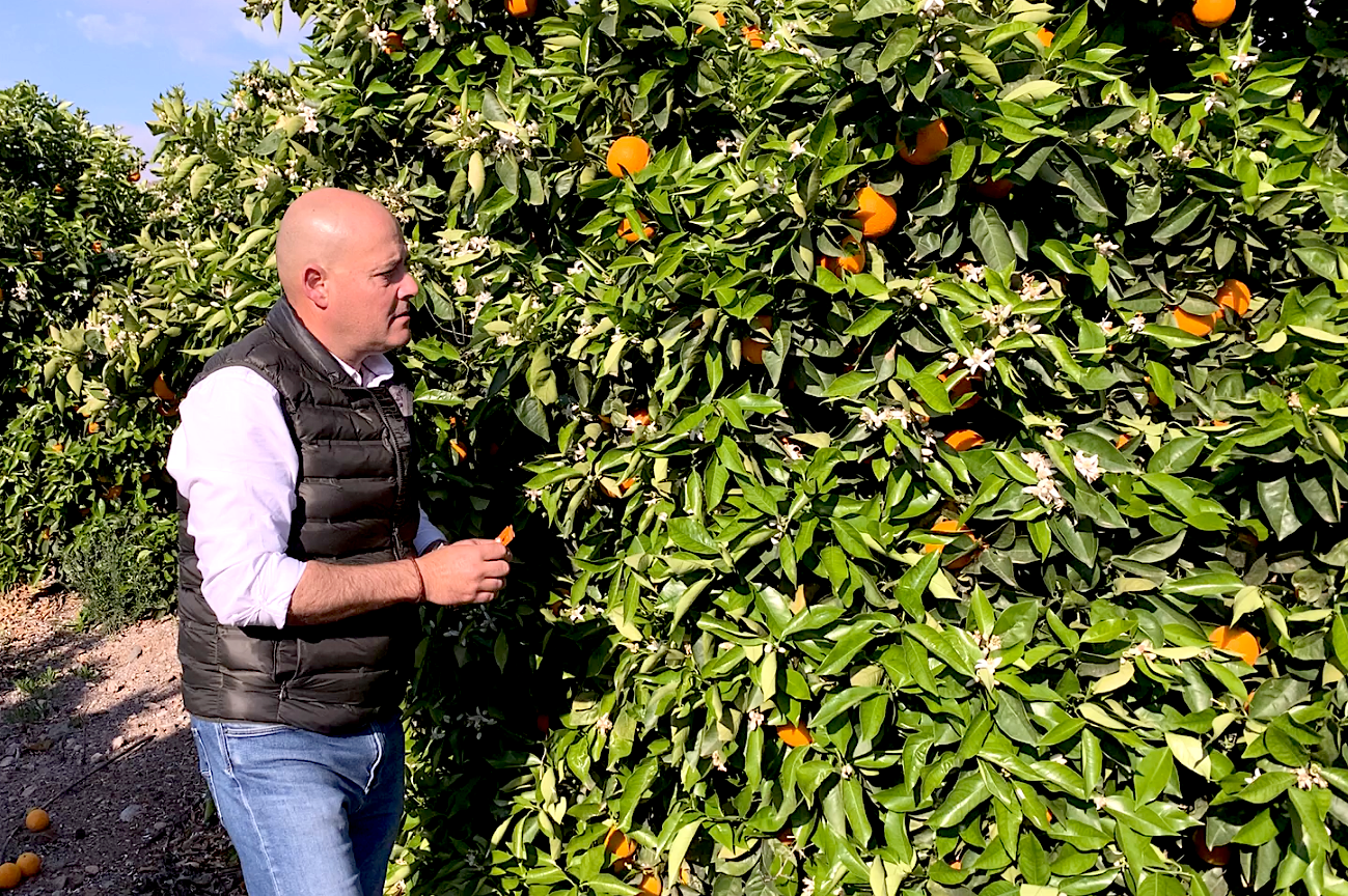 Juan Miguel Rodriguez, Citrus Manager de Koppert, examina una finca de naranjos en Murcia.
