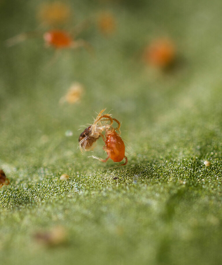 Los ácaros de Phytoseiulus persimilis buscan y depredan activamente la araña roja de dos puntos (Tetranychus urticae). El ácaro depredador no puede alimentarse de otras presas.