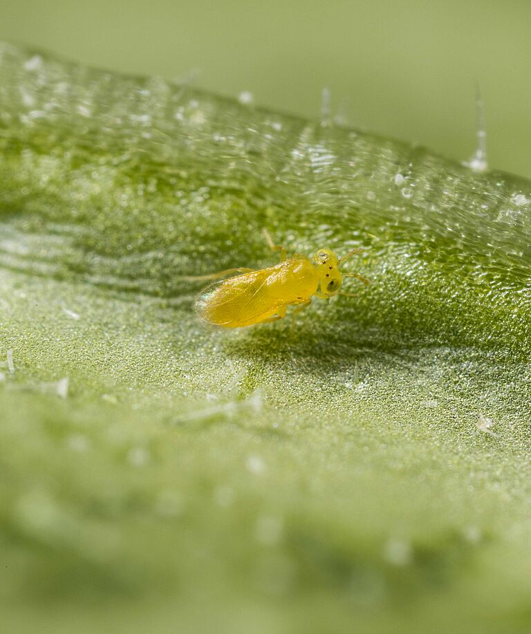 Las moscas blancas son plagas comunes que se alimentan de la savia de las plantas y transmiten enfermedades vegetales. Encarsia formosa (En-Strip) y Eretmocerus eremicus (Ercal, Enermix) son avispas parásitas conocidas por su eficacia en el control de las poblaciones de mosca blanca.