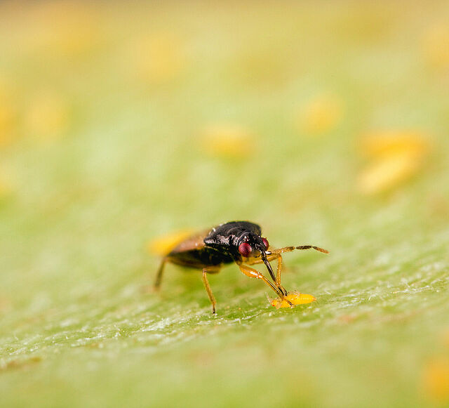 Fase ninfal: Las ninfas de Orius laevigatus son el principal estadio depredador. Parecen versiones más pequeñas de los adultos, pero carecen de alas completamente desarrolladas. Las ninfas son amarillas al principio y se oscurecen (de naranja a marrón) al madurar. Tienen piezas bucales perforadoras y succionadoras con las que se alimentan de trips y otros insectos pequeños.