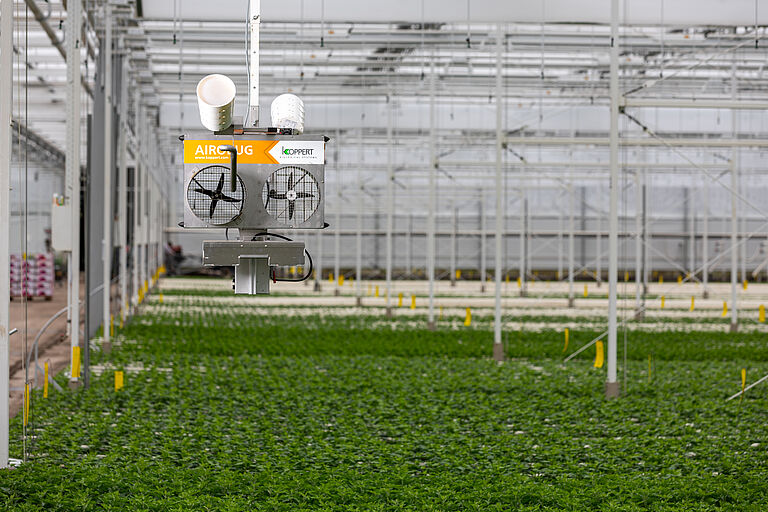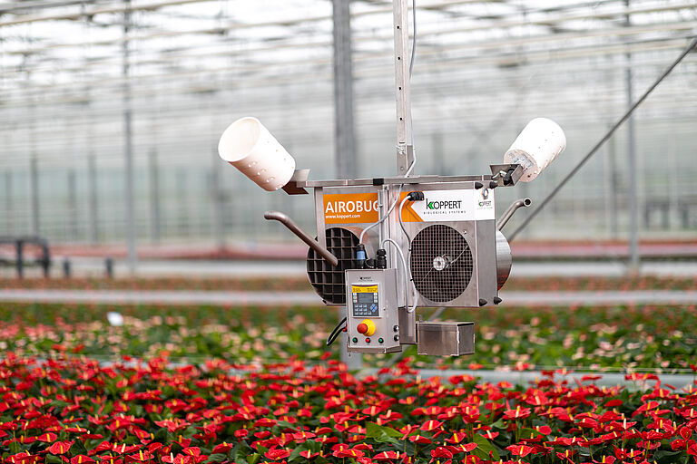 Airobug es un soplador completamente automático que se utiliza para grandes superficies y distribución en finca completa en cultivos de alta tecnología. El ventilador especial Airobug, en combinación con la dosificadora giratoria, asegura una liberación uniforme del material portador que contiene los enemigos naturales. El flujo de aire del ventilador garantiza la distribución uniforme de este material hasta una distancia de 10-12 metros.