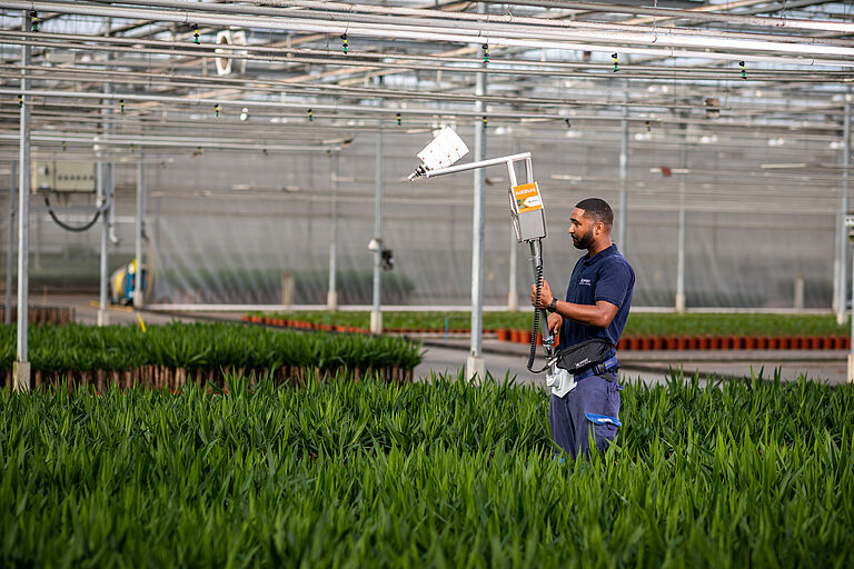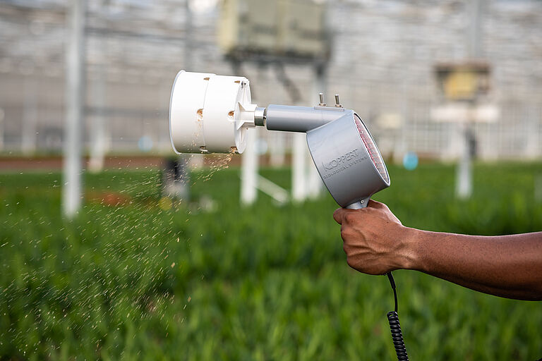 Los sistemas de soplado de Koppert están especialmente desarrollados para una distribución eficaz y eficiente de los enemigos naturales. Esta distribución uniforme da como resultado un control biológico efectivo de plagas, ya que los ácaros pueden alcanzar las plagas más rápido.